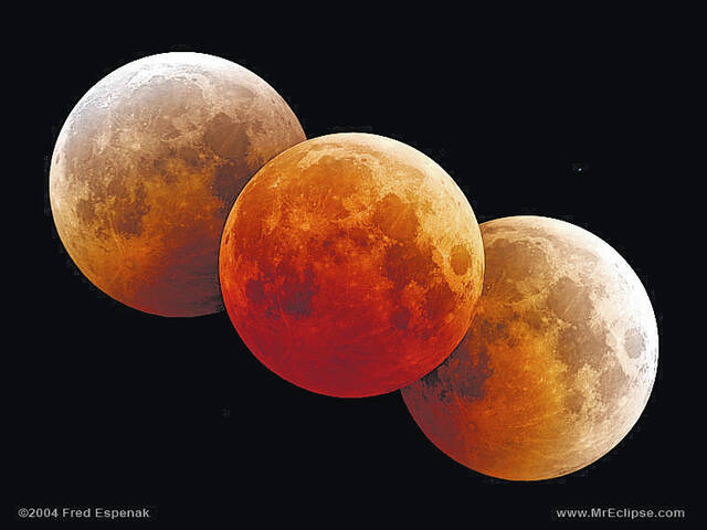 At this point, a portion of the full moon will be much dimmer than normal, appearing a burnt orange or auburn color in the sky. The colors you see will be all of the Earth’s sunrises and sunsets refracted onto the moon by our atmosphere. This is why the moon doesn’t completely disappear behind Earth’s shadow. No two lunar eclipses are exactly alike, as atmospheric dust differs from eclipse to eclipse.