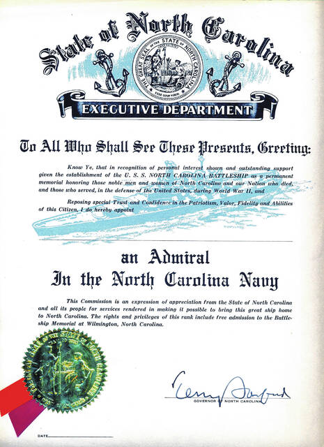 The North Carolina General Assembly passed legislation to create the Battleship Commission. Governor Terry Sanford was given the power to appoint 15 members and authorized the commission to raise the funds necessary to bring the ship to North Carolina. Eleven men were appointed to the commission headed by Hugh Morton. Governor Sanford appointed an “Admiral” in each of the state’s 100 counties to assist in raising the funds. Each person who contributed $100 or more was named an “Admiral” in the “North Carolina Navy” with free admission for life.