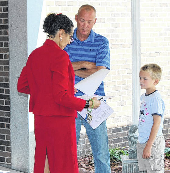 Aiden Robeson, a third-grader, gets a friendly welcome to his new school from Principal Dia Collins-Thomas at Bladen Lakes Primary during Thursday’s Open House. Max Robeson, his father, said they moved here from Camden.