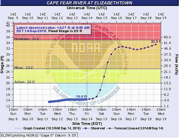 ELIZABETHTOWN — The Cape Fear River may exceed Hurricane Matthew levels at two measuring stations in Bladen County as a result of Hurricane Florence.