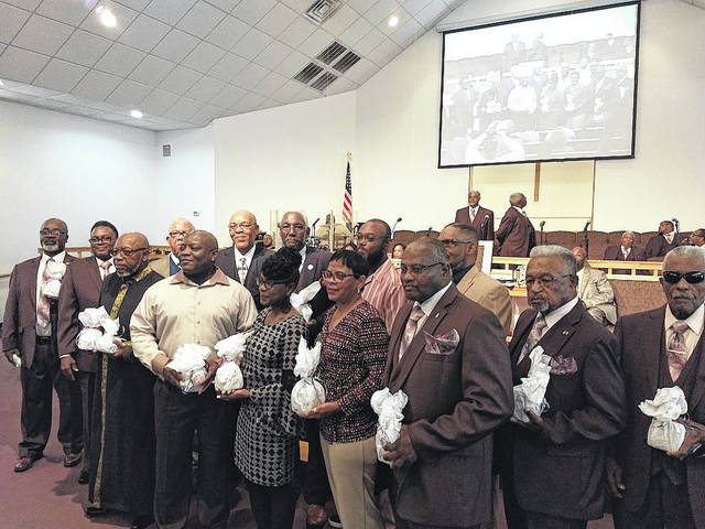 In the ceremony at Baldwin Branch Missionary Baptist Church were (front, from left) Minister Mac Melvin, Minister Charles Crocker, Pastor Louie Boykin, Walter Rhodie, Jr., Tankeisha Graham, Jessica Wilson, James Smith, James McDowell, Bennett McDowell, (back, from left) Kenneth McKoy, Rudolph Ford, Matthew Cromartie, Edron Lewis and Timothy Fulmer.
