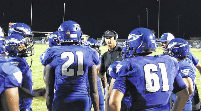 East Bladen head coach Robby Priest talks with his team during the season-opener against Clinton. The head coach learned this week he is cancer-free.