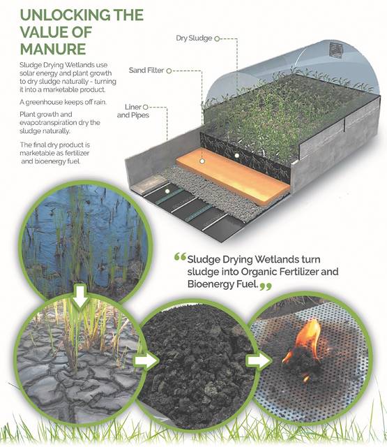 The process of using sludge drying wetlands by Phinite gives farmers an opportunity to repurpose for bioenergy fuel and organic fertilizer.