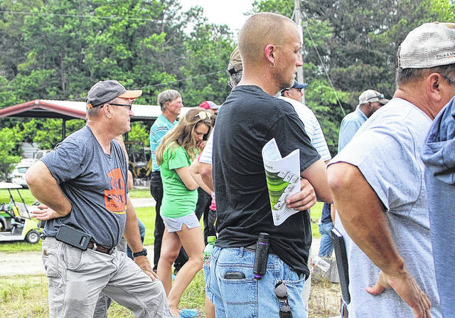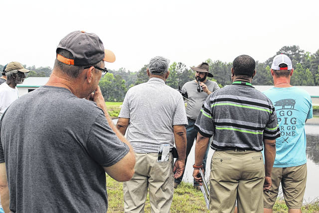 Michael Inman (foreground left) and other farmers listen as Jordan Phasey, CEO of Phinite, discusses the benefits of sludge drying wetlands.