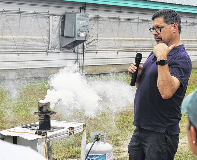Chris Hopkins, a research associate of forest biomaterials with the College of Natural Resources at N.C. State University, gave farmers a demonstration of the dried sludge burning.