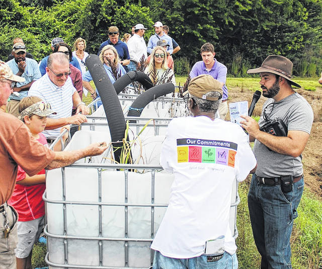 Jordan Phasey (right), an award-winning environmental scientist, talks with farmers at one of three small wetlands built for testing purposes.