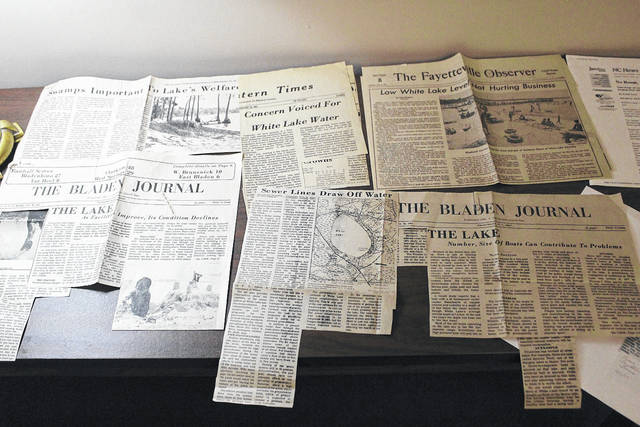 Lauritsen’s PowerPoint presentation included a history lesson that showed low water levels and health issues with the lake dating back more than a quarter century. The Bladen Journal and Fayetteville Observer sample newspaper clippings on a table included headlines of “Grim White Lake Picture is Painted,” “The Lake: As Facilities Improve, Its Condition Declines,” “The Lake: Number, Size of Boats Can Contribute To Problems,” “Killing the lake they love,” “Concern Voiced For White Lake Water,” and “Swamps Important To Lake’s Welfare.”