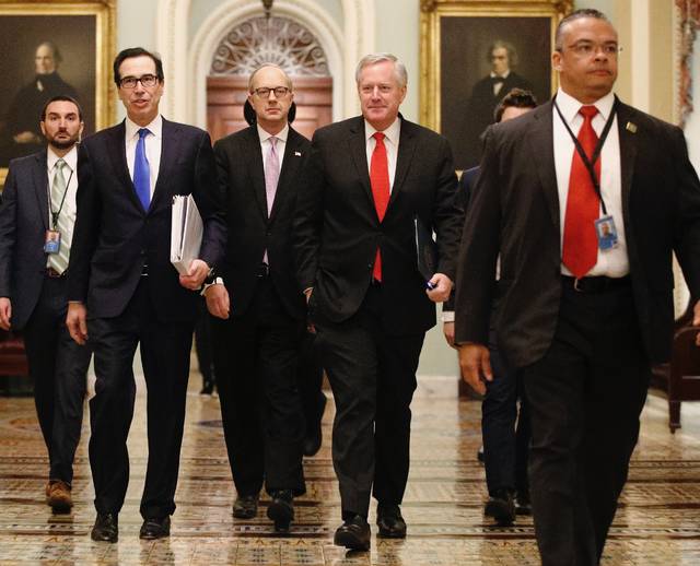 Treasury Secretary Steven Mnuchin (left) accompanied by White House Legislative Affairs Director Eric Ueland and acting White House chief of staff Mark Meadows, walks to the offices of Senate Majority Leader Mitch McConnell on Capitol Hill on Tuesday. Just after midnight, leaders said they have a deal.
