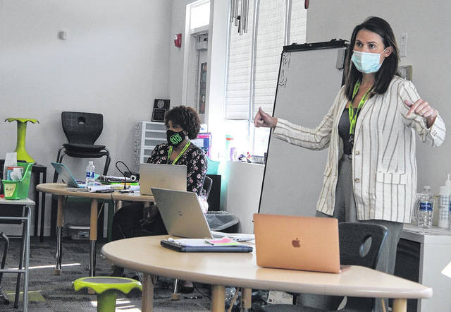 “And we’re trying to teach like we normally would in the classroom, and we move from topic to topic,” Taylor said. “It’s a juggling act. And like Julie said, she came from elementary and I came from elementary — juggling more students has been different also. I guess each grade level has its own challenges.”