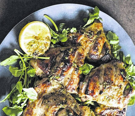 Place the watercress on a serving platter, creating a bed for the chicken. Using tongs, place the chicken on top of the watercress. Squeeze 3 tablespoons juice from 1 or 2 of the lemon halves, then stir the juice along with the fresh oregano into the lemon-garlic oil to make the salmoriglio. Drizzle the sauce over the chicken and serve with the remaining lemon halves for squeezing.