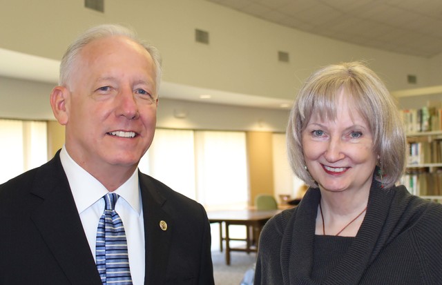 DUBLIN — Bladen Community College President William Findt stands with acclaimed poet Beth Copeland during her recent visit to campus for a poetry reading and student workshop. Copeland read excerpts of her published works, and shared poems from her next book, soon to be published.