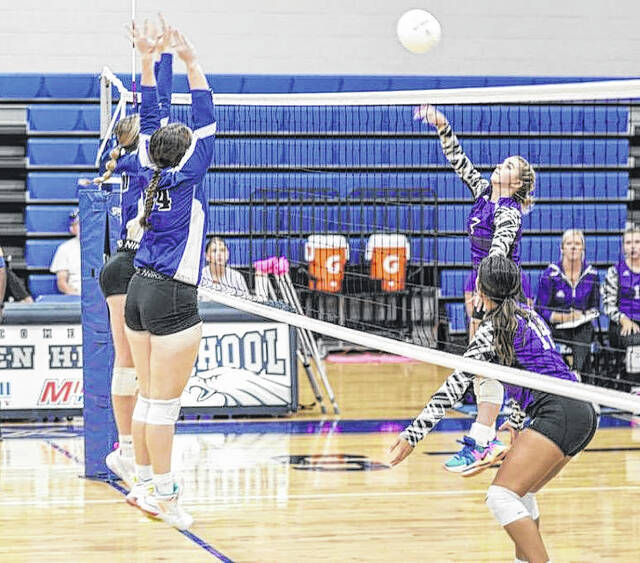 West Bladen’s Greer Pope (9) returns the ball as East Bladen’s Aubrei Nixon (24) and Taylor Dowless (11) go for the block during Wednesday’s volleyball match.