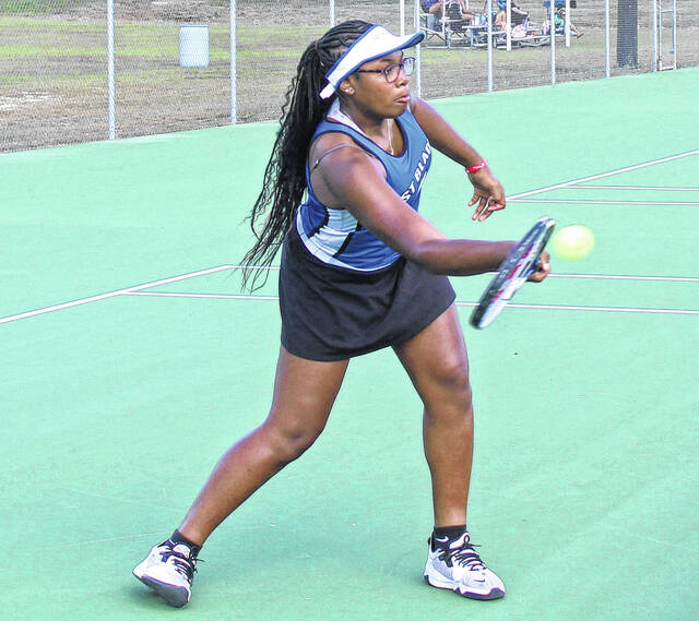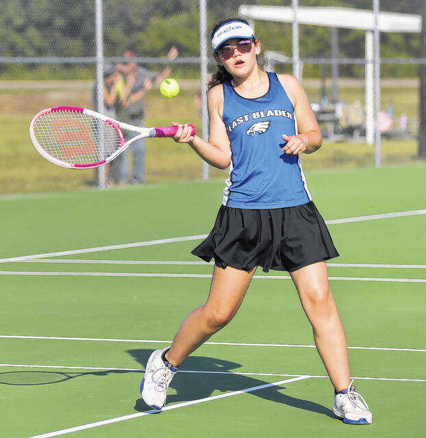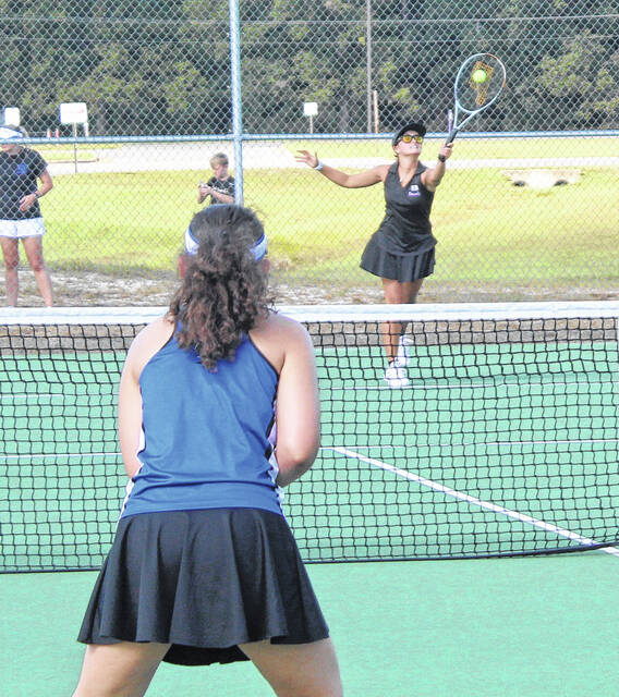 West Bladen’s Lileigh Anderson (far court) serves to East Bladen’s Ruby Stephens in the No. 2 singles match.