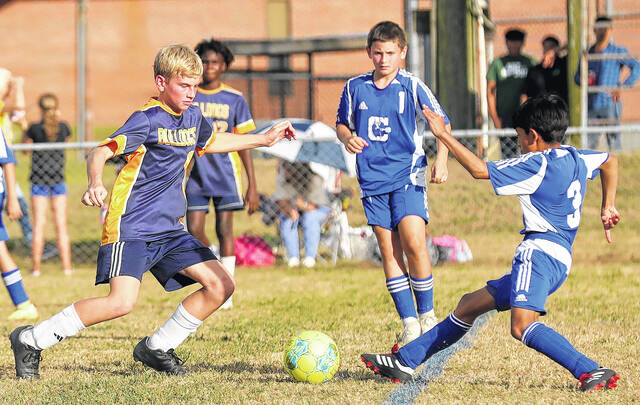 Bladenboro and Clarkton players battle for the ball during Monday’s boys’ soccer game. Bladenboro won in a shootout.