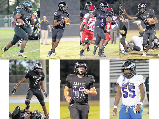 Members of the East Bladen football team named All-Carolina Conference were, from top left, Dashon Campbell, Keyshawn Kemp, Julius Battle and Jaden Lewis. Bottom from left, Bradley Townsend, Jaxon Hair and GeReal Maye.