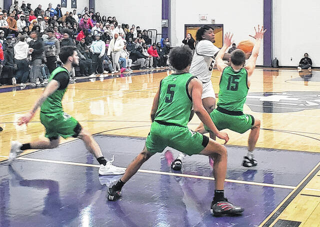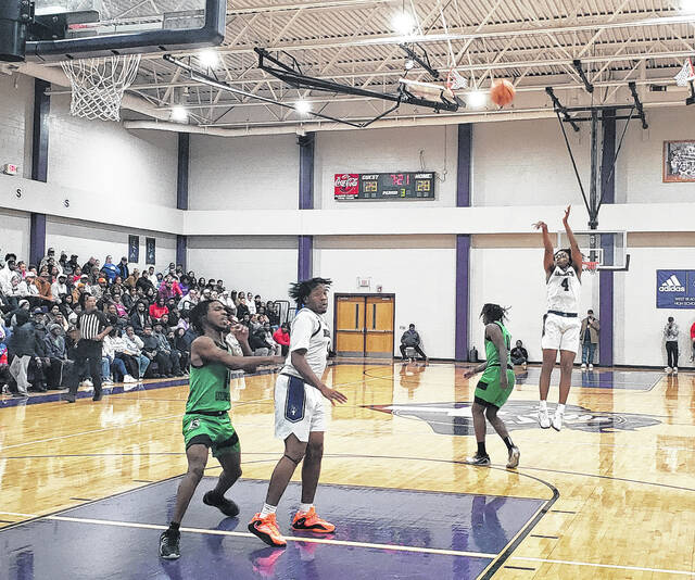 West Bladen’s Tylik McCall takes a shot against West Brunswick. McCall had 31 points and 14 rebounds.