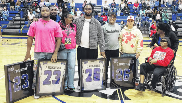 Farrell Murchison (No. 23) and Larrell Murchison (No. 26) stand with family members Tuesday, Feb. 10 during their football jersey retirement ceremony at East Bladen High School.