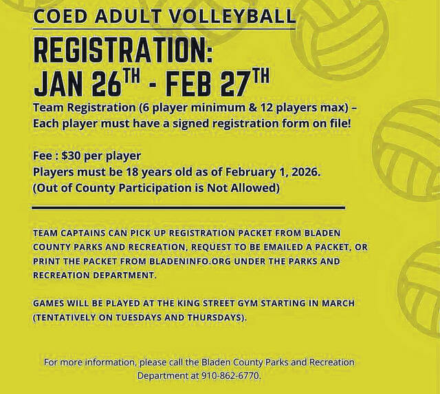 • Coed adult volleyball registration open only for Bladen residents ends Feb. 27. Players must be 18 years old as of Feb. 1, 2026. The fee is $30.