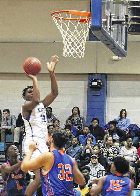 East Bladen’s Javont McDowell soars high for a basket against Whiteville in Tuesday’s Three Rivers Conference clash. The Eagles won, 54-44.