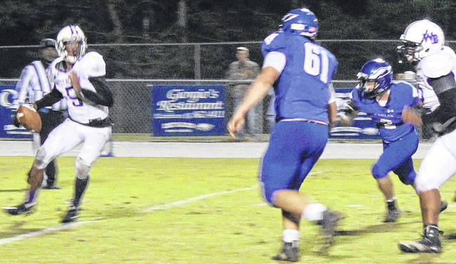 West Bladen’s Tyre Boykin (5) looks downfield, trying to avoid the rush of Jordan Stanley (61) and Zac Hester.