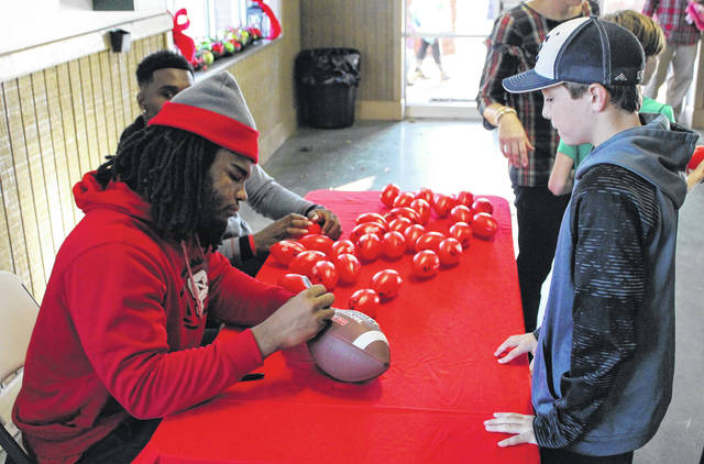 Jayce Hatcher, who played in the Dixie Youth Baseball World Series in August, gets his football autographed by former East Bladen standouts Larrell (left) and Farrell Murchison. Larrell played at N.C. State, and Farrell at Winston-Salem State.