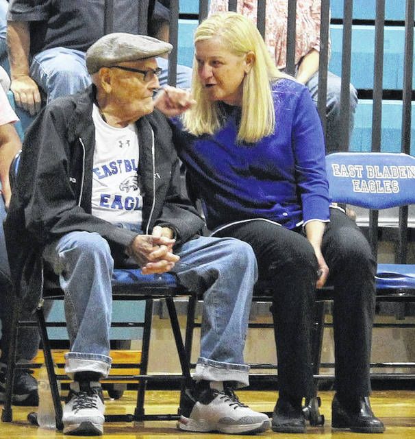 East Bladen head coach Patty Evers makes the customary pregame visit with Scoop Campbell, a regular on her bench.