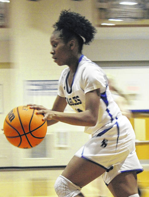 East Bladen’s Alexus Mitchell drives the baseline in the second half on Tuesday night in a 58-47 overtime loss to St. Pauls.