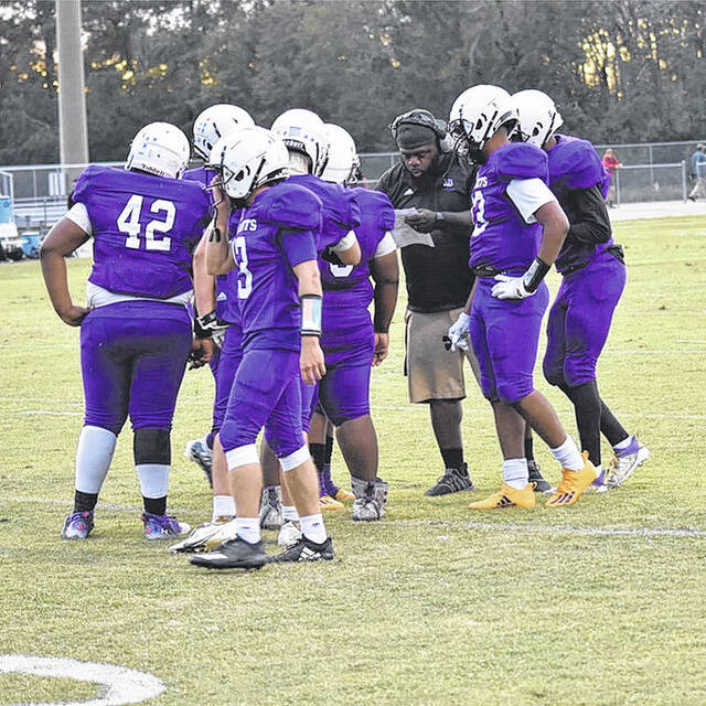 West Bladen Head Coach Stanley Williams talking to his offense during a timeout.