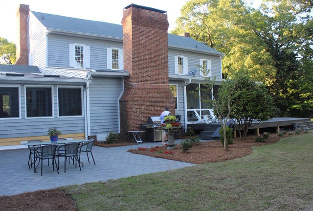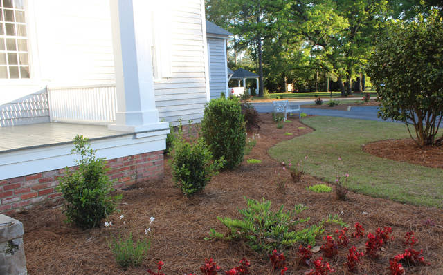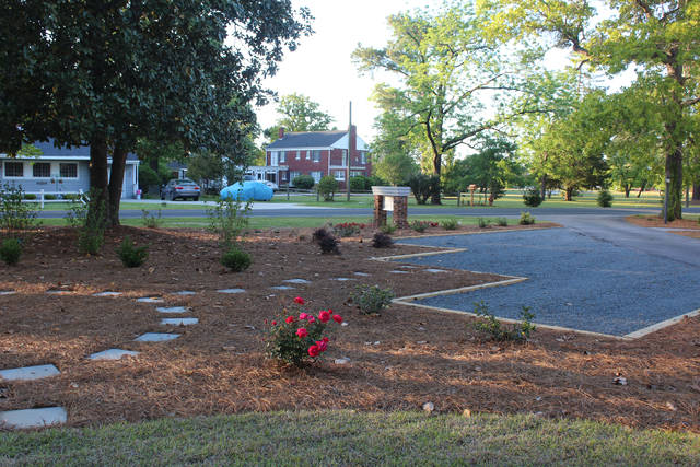 Outside, a deck has been added to the rear of the home, and parking spots, stepping stones, and a sidewalk have been added to the front, along with landscaping all around. A bell that was located on the rear of the property was moved near the gazebo.